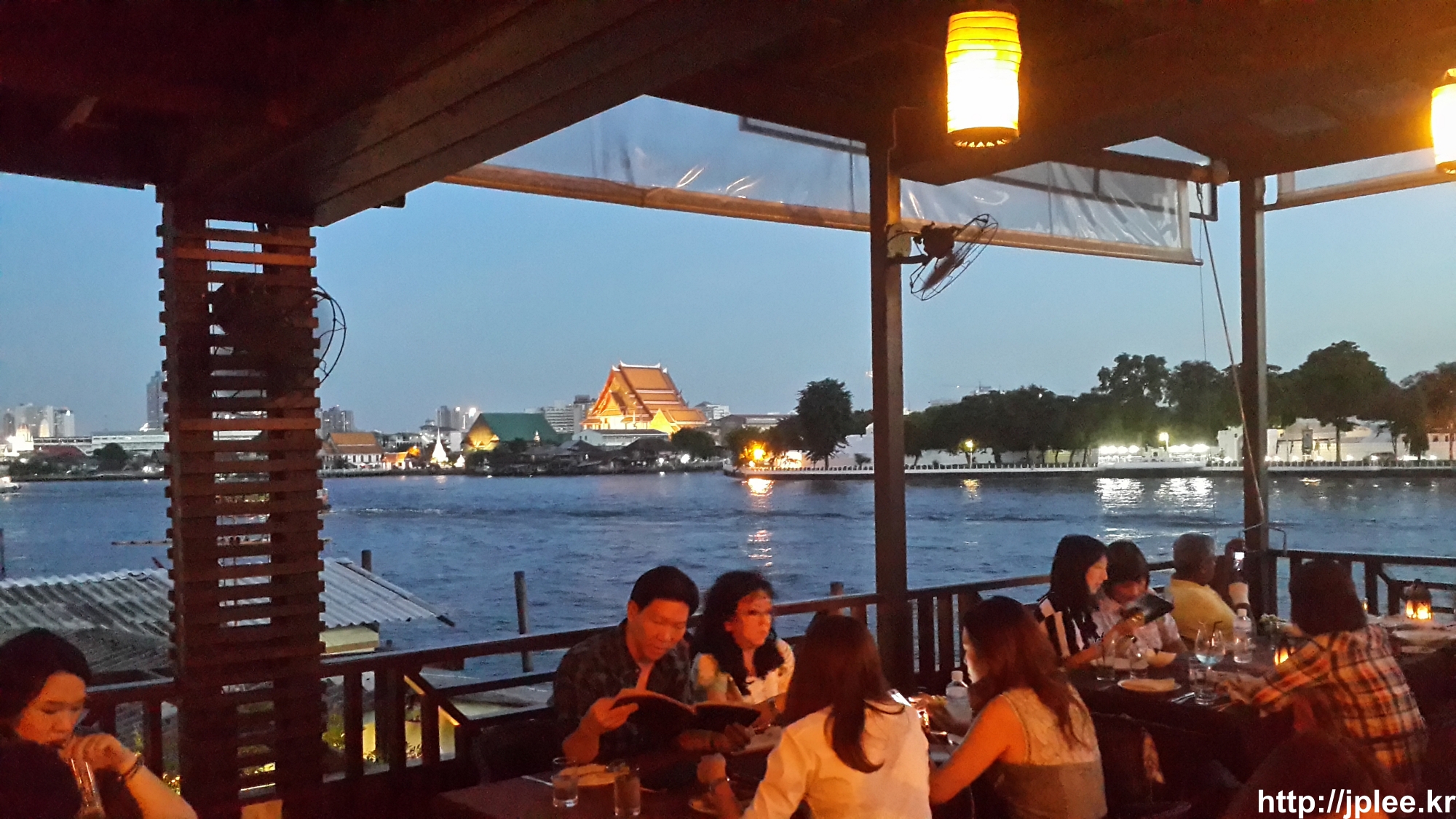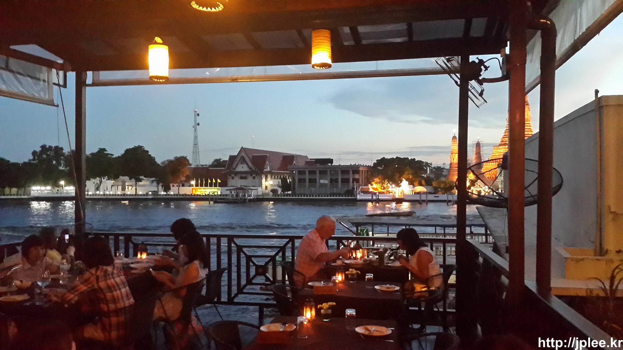 강 건너의 새벽사원(왓 아룬)의 야경을 보면서 식사가 가능하다.