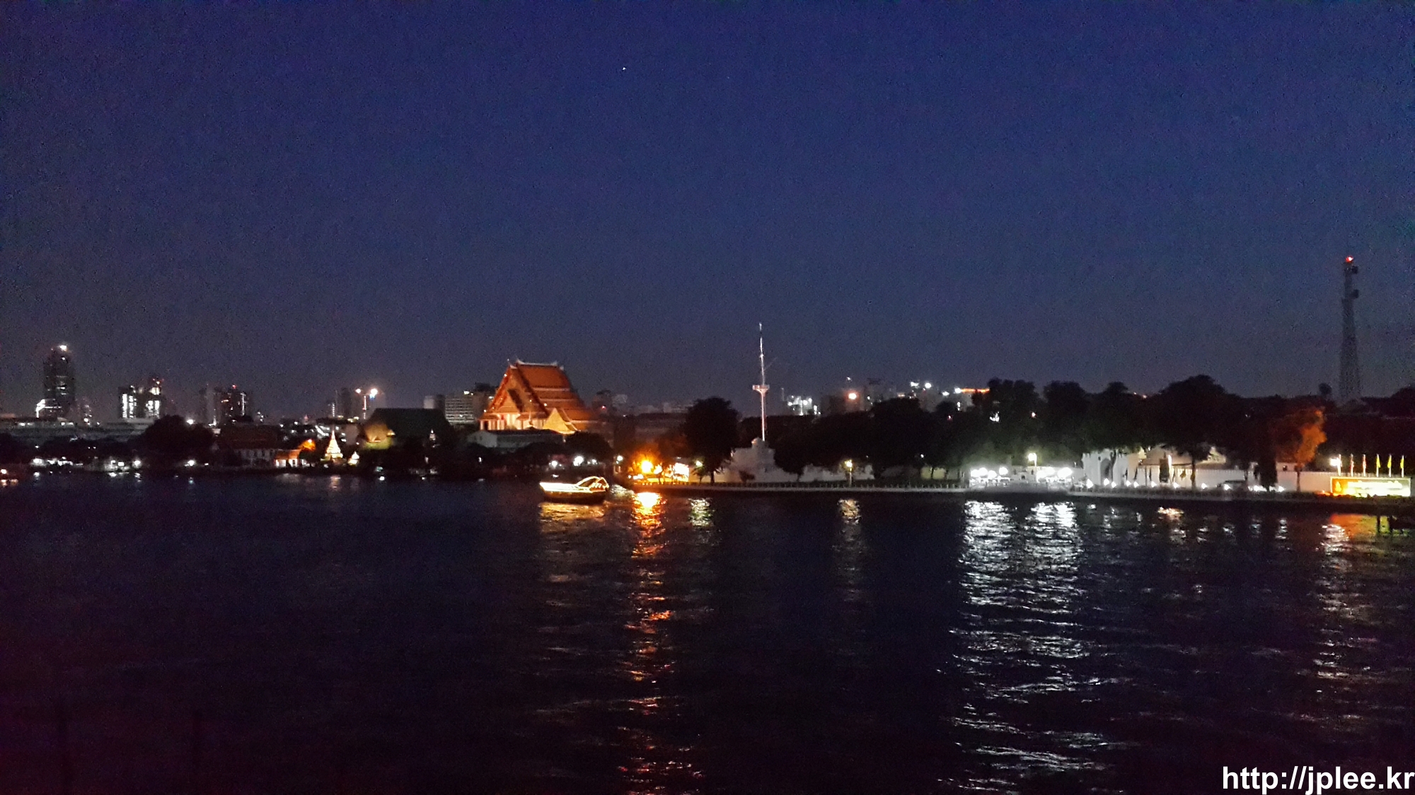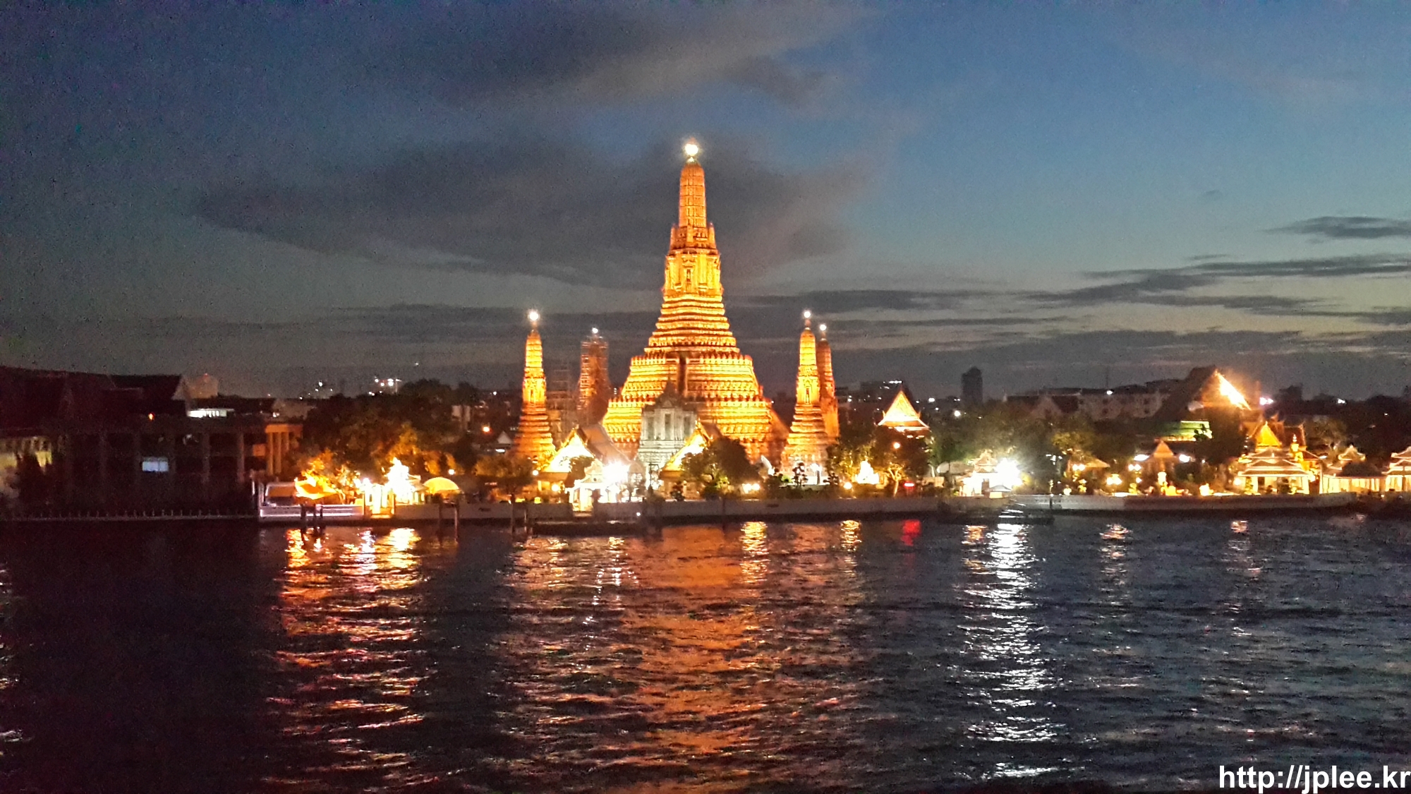 강 건너의 새벽사원(왓 아룬)의 야경을 보면서 식사가 가능하다.