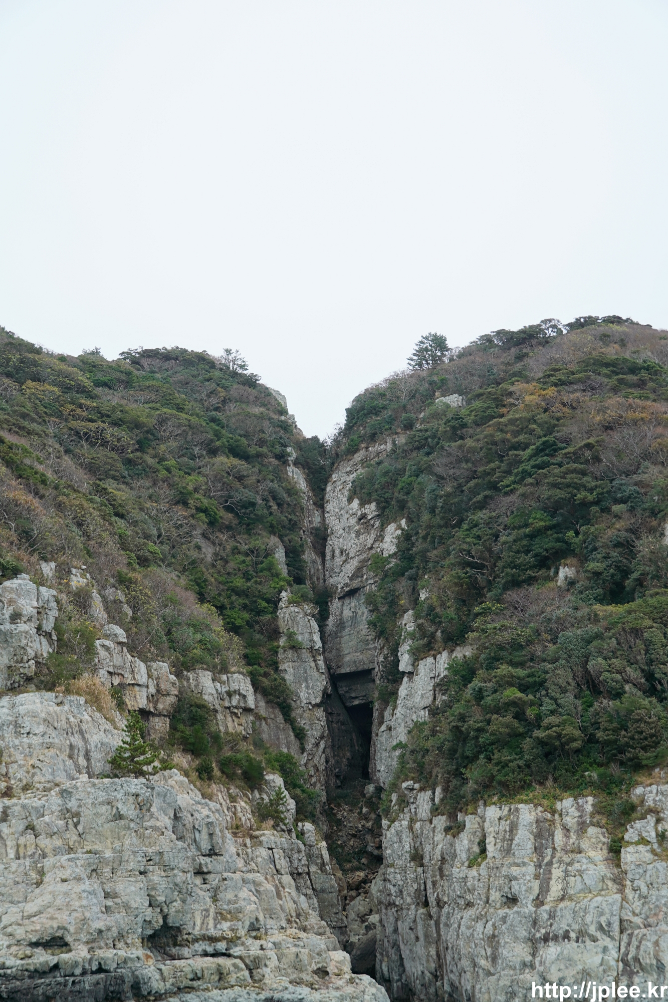 기암괴석의 절벽 한가운데 동굴이 뚫려있다.