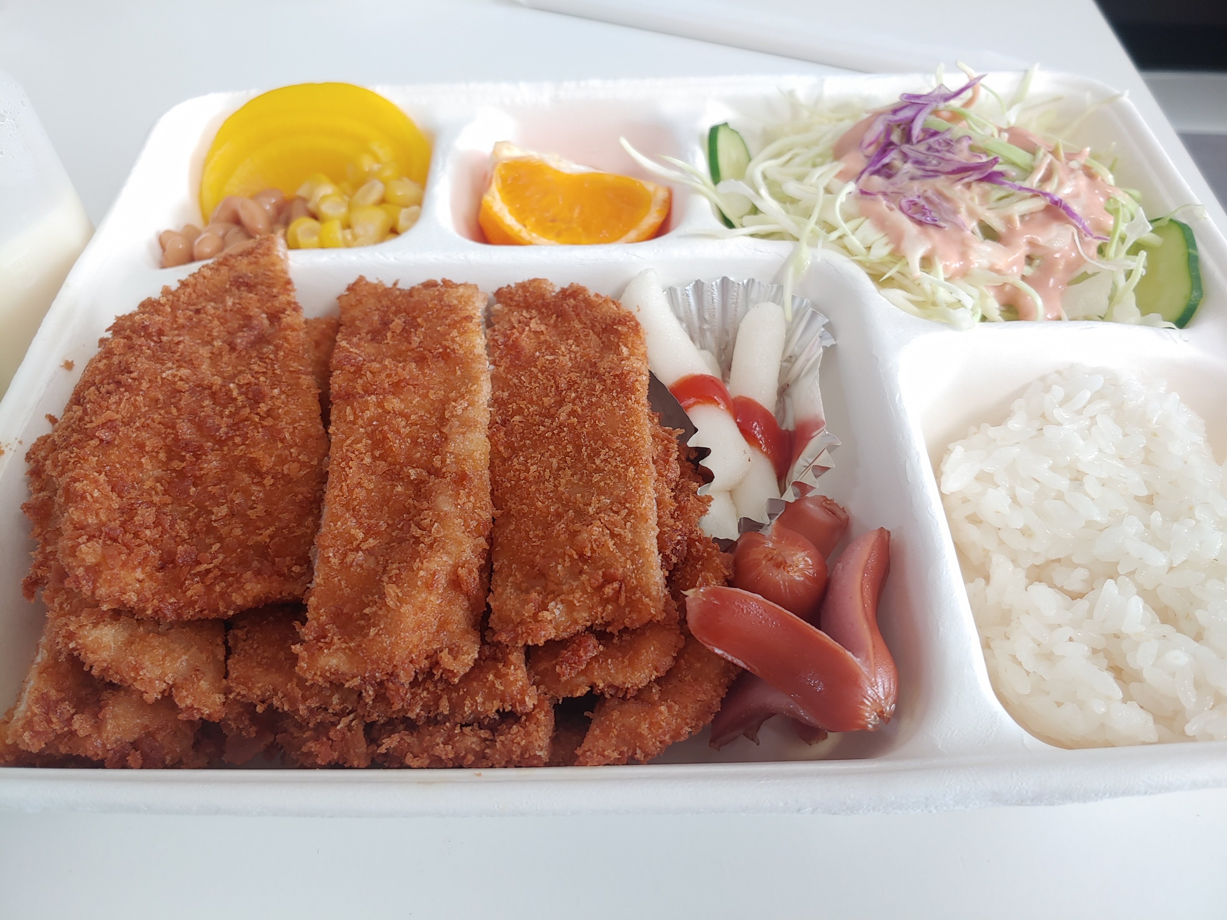 비엔나소세지와, 샐러드, 과일, 단무지와 옥수수, 베이크빈으로 이뤄진세팅은