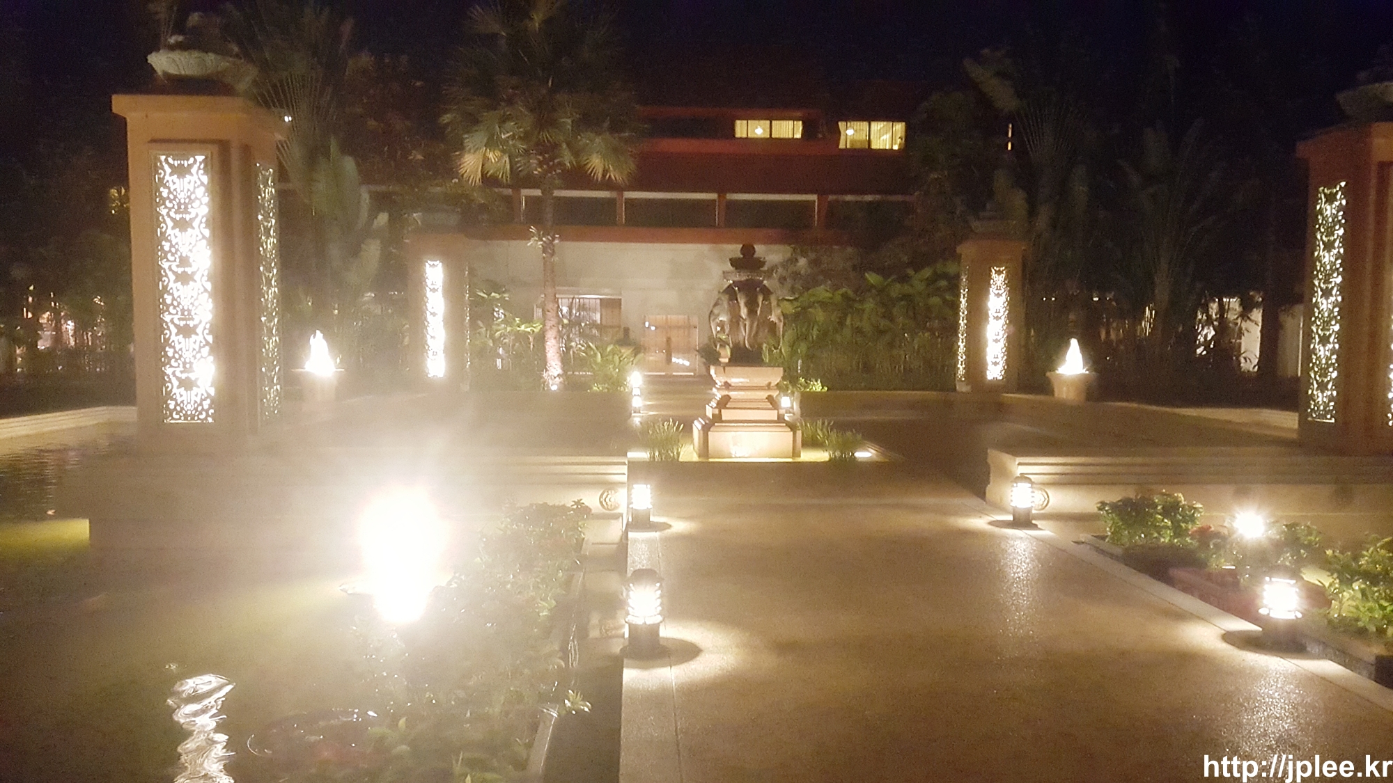 레스토랑 앞쪽으로 코끼리 조각상이 있는 연못이