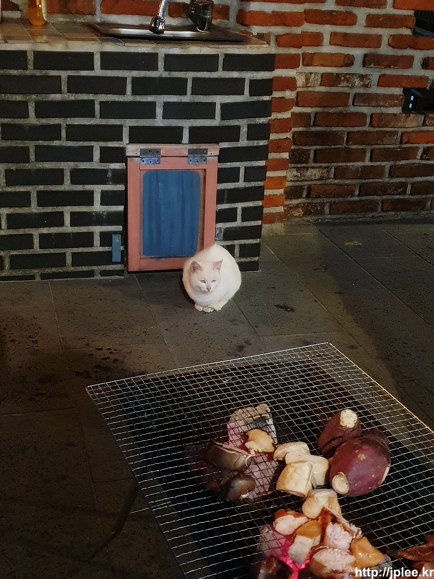 이 동네 고양이 한 마리가 와서 눈치를 보고 있는데,
